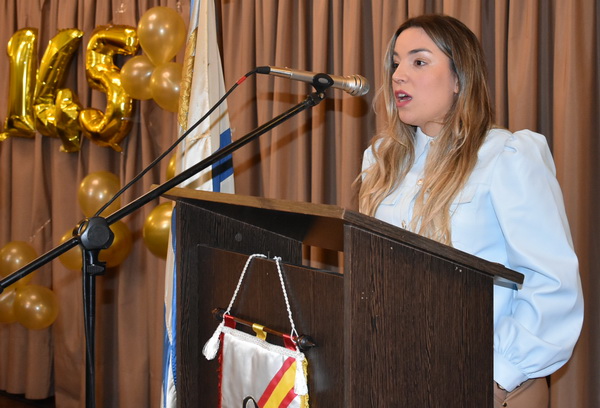 Luego de la ejecución de los himnos de Uruguay y España interpretado por el coro,., la secretaria de la institución M.. Eugenia Cotelo ha hecho de maestra de ceremonia.presentando a los oradores..