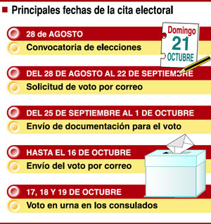 Los electores residentes en el extranjero que deseen votar deberán solicitar su voto a la Delegación Provincial de la Oficina del Censo Electoral (OCE) correspondiente a su inscripción, hasta el 22 de septiembre en el impreso oficial correspondiente.