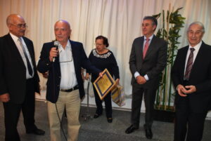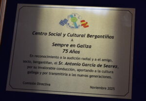 La ocasión ha sido propicia para la entrega por parte de esta institución al bergantiñano y colega Toni de Seares de una plaqueta en reconocimiento a sus 75 años de trayectoria en su audición Sempre en Galiza, recientemente cumplidos.