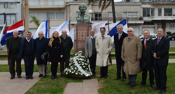 Luego de la parte oratoria el secretario de la federación Hector H. Henrry ha invitado a las autoridades a colocar la ofrenda floral al pie del busto de Rosalía de Castro y allí logramos esta foto de familia en este mediodía gris y frio pero con calor en los corazones de todos los gallegos.