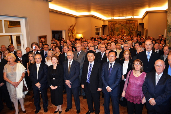 El embajador Roberto Varela Fariña flanqueado por la consejera y el Consul gral. agradeció especialmente a las altas autoridades políticas y diplomáticas que han aceptado su invitación y también a las empresas patrocinadoras del evento por hacerlo posible en tiempos de austeridad.