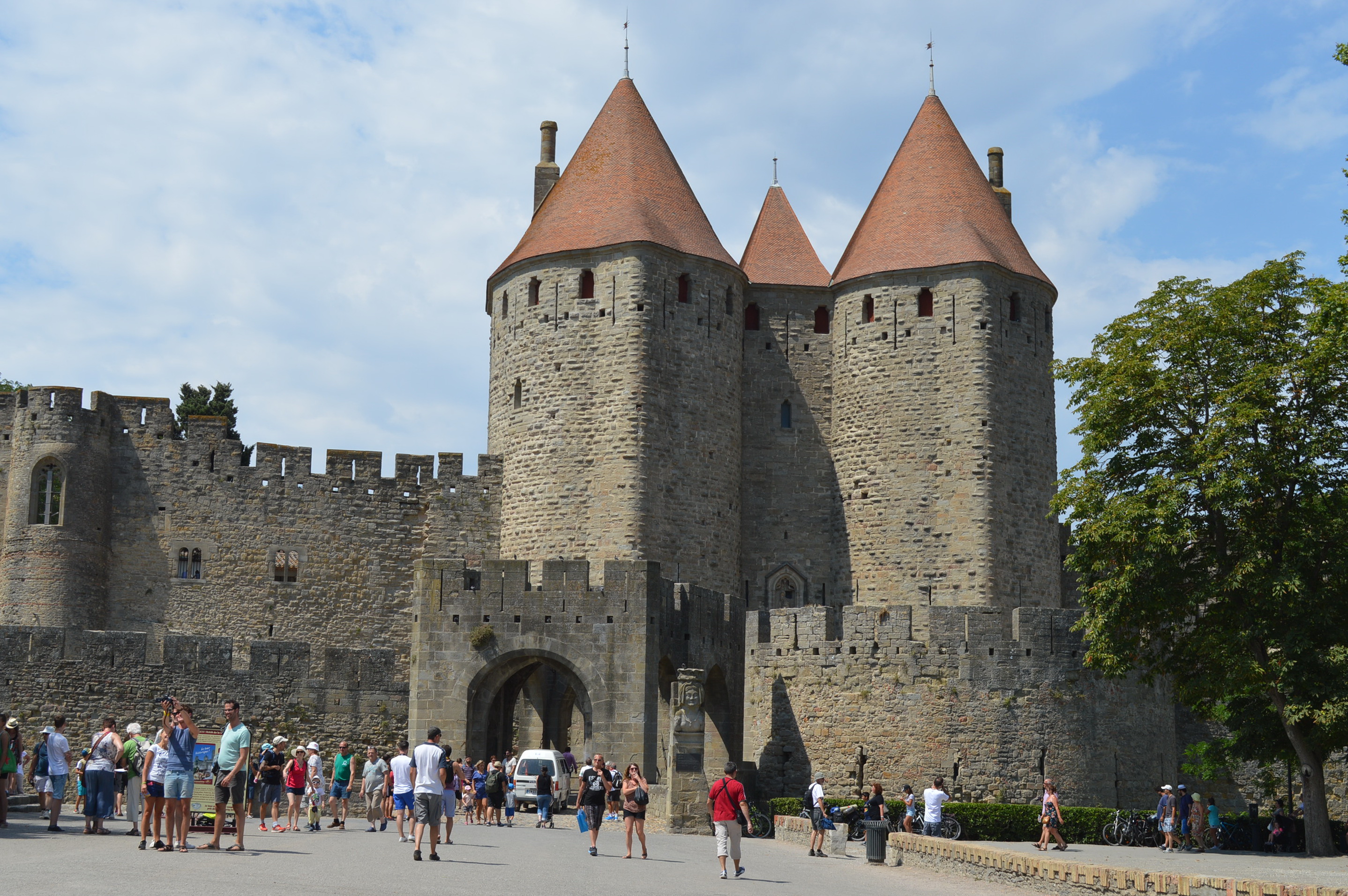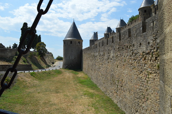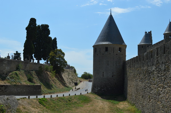 Rodeada por una doble muralla de 3 km de longitud, en su interior se conserva el aspecto de las ciudades medievales europeas con calles angostas y tortuosas, edificaciones de fachadas con entramados, barrios de artesanos y gremistas, junto con elementos propios, como el castillo de los condes de Carcasona y la basílica de Saint-Nazaire.