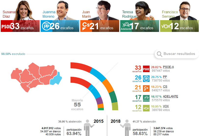 Con el 95% del escrutinio, el PSOE ha obtenido el 28,34% de los votos (33 diputados); el PP ha quedado segundo, con el 20,64% y 26 diputados– el peor resultado de su historia- y Ciudadanos ha subido a la tercera posición, sorpasando a Adelante Andalucía, con el 18,09% de los sufragios y 21 diputados. La unión de Podemos e IU ha sido votada por el 16,16% de los electores, lo que supone 17 escaños- pierden tres con relación a los anteriores comicios- y la sorpresa mayúscula de estos comicios viene con la entrada de la ultraderecha al Parlamento andaluz, a través de Vox, que irrumpe con 12 diputados gracias al 10,87% de los votos.