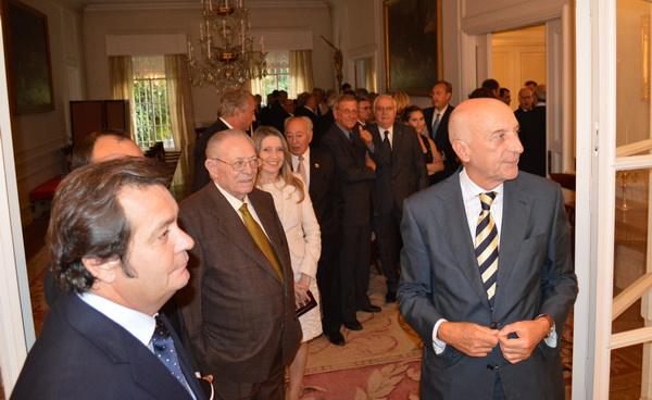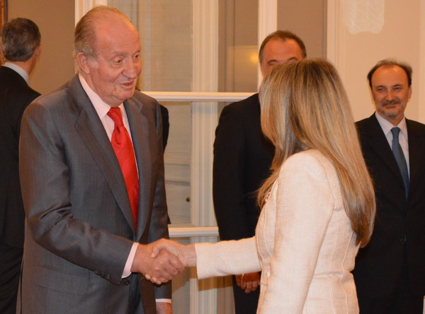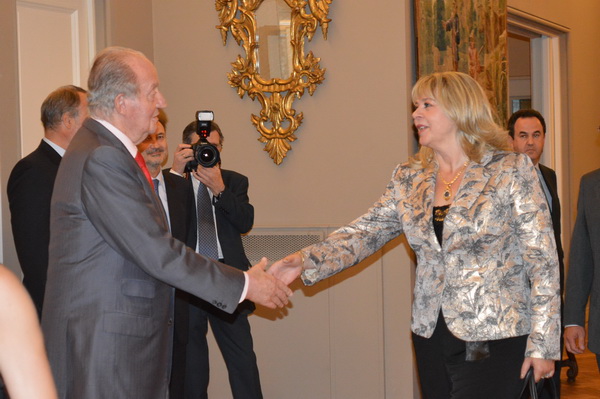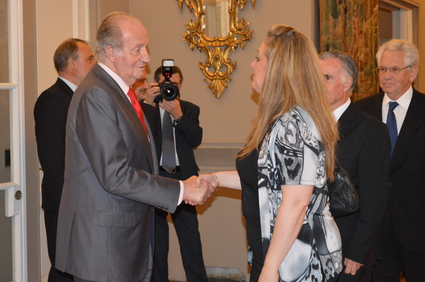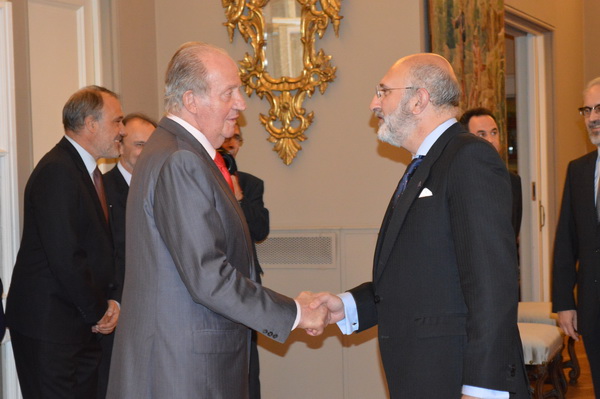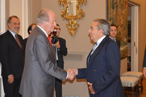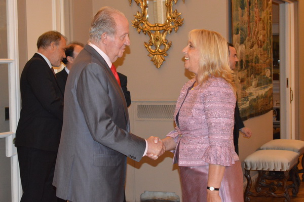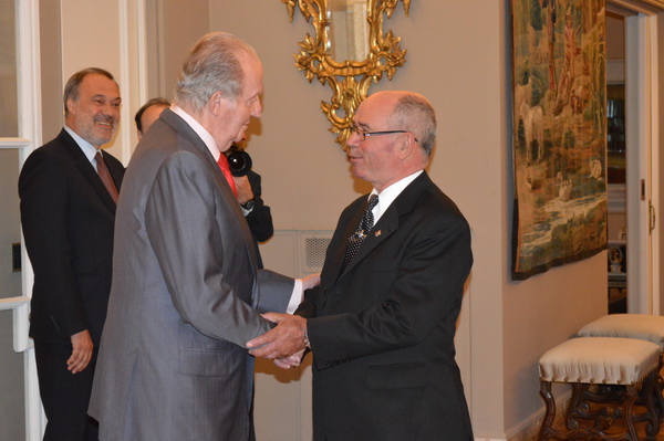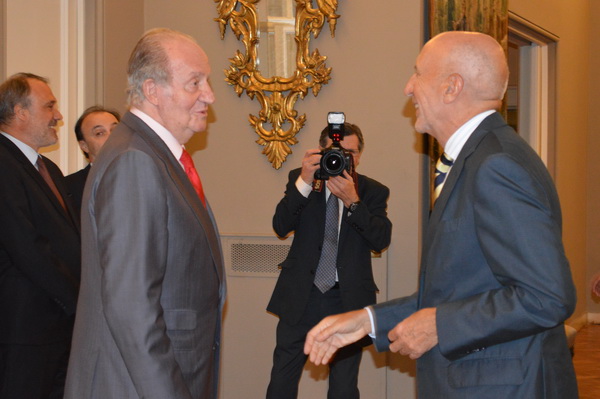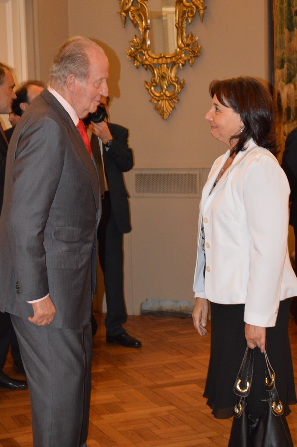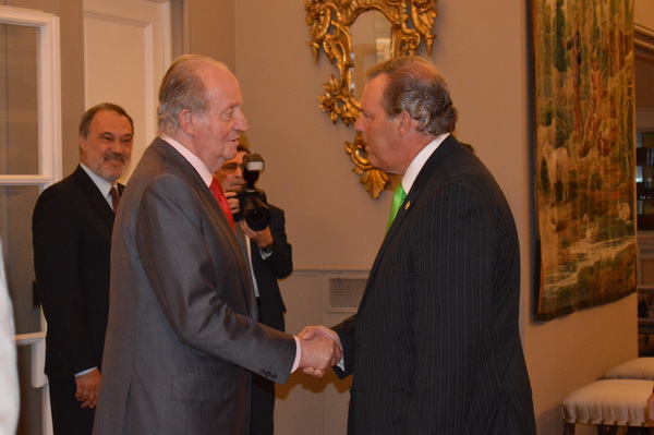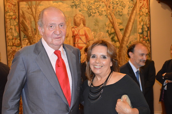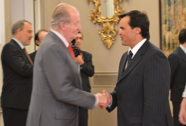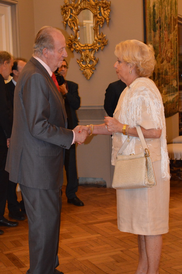 Como indica el protocolo, la casa real es quien organiza el saludo a su majestad y con un estricto orden se realiza saludando uno a uno los invitados. Luego, para que la reunión se desarrolle con tranquilidad, se invita a los periodistas a dejar sus cámaras, totalmente entendible, aunque muchos nos pedían esa foto conversando con el Rey. Algunos lograban la instantanea con su celular y D.Juan se prestó amablemente.