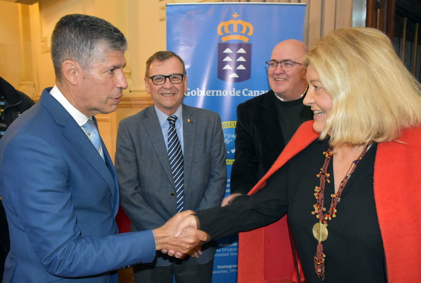 María Beatriz Bergalli y la vicepresidente de los canarios en Uruguay Micaela Carvidón junto al consejero Vicente Pecino han recibido en el CCE a la delegación de canarios a tales efectos.