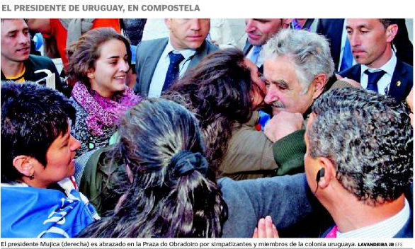 El líder uruguayo había arribado a Compostela en el marco de una gira de 16 días de duración por China, Italia, el Vaticano y varios lugares de España: Andalucía, Madrid, el País Vasco… En Galicia, comunidad elegida para cerrar la etapa ibérica del viaje, se detendrá 23 horas, la tarde del domingo y buena parte del día de hoy, que empleará en inaugurar un plaza dedicada en la capital gallega al general José Gervasio Artigas, conocer el puerto exterior de Punta Langosteira y asistir a un almuerzo organizado por la Confederación de Empresarios de Galicia. «Venir a España y no venir a Galicia sería una felonía para mis compatriotas», confesó.