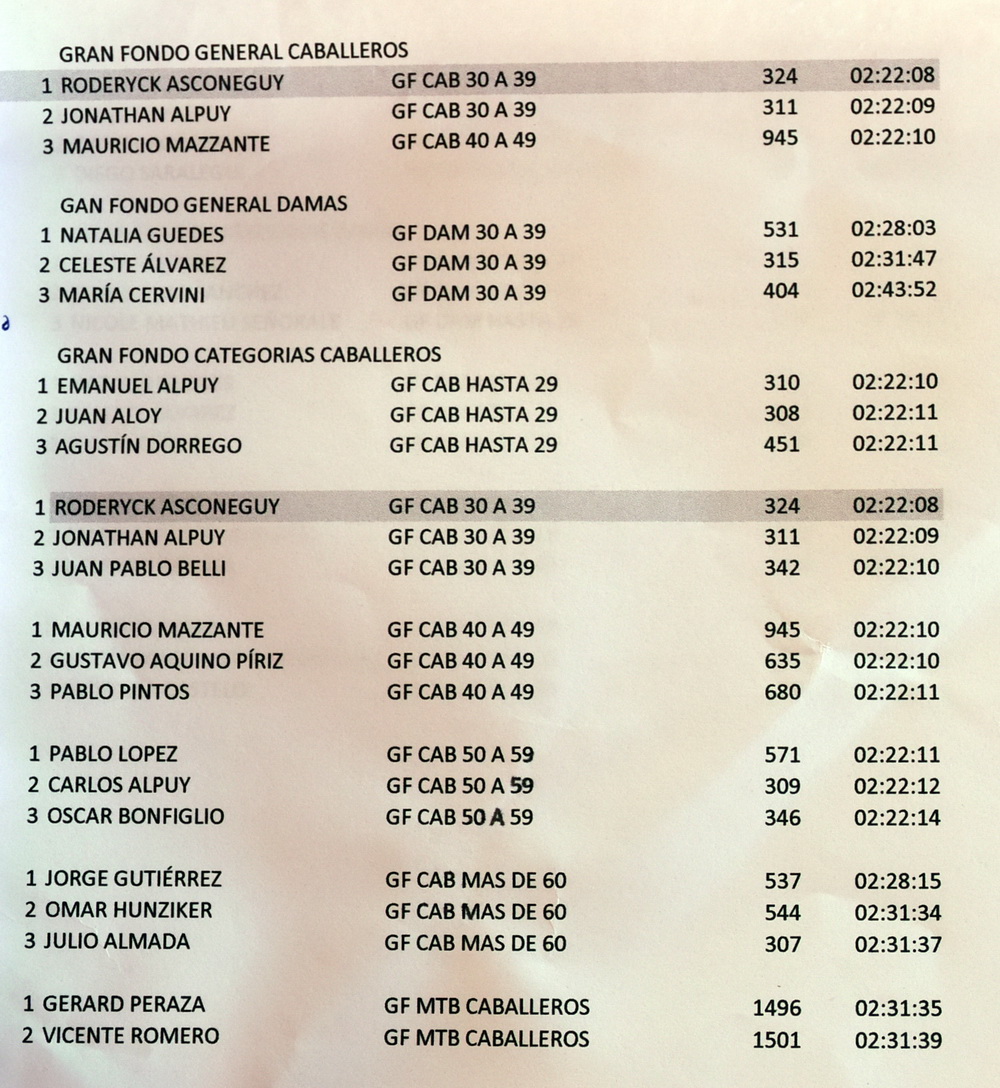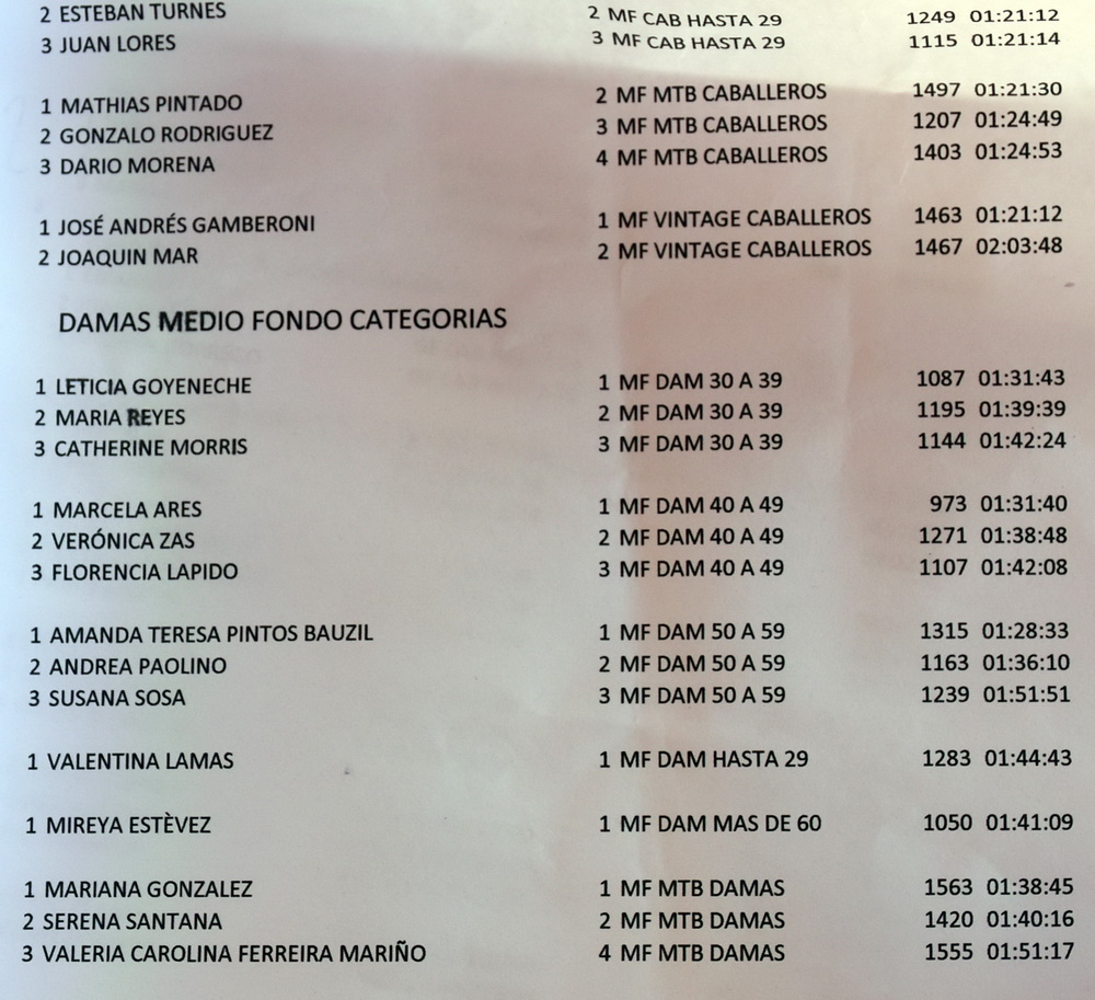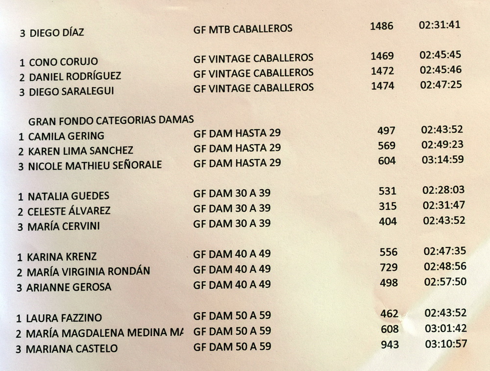 Gran Fondo Gral. Damas cat. 30 39 años. Natalia Guedes, 2H.28.03 Celeste Alvarez, 2H 31.47 y María Cervini 2 H 43 52