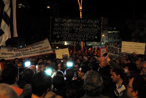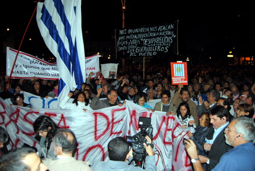Indignados,  pero pacíficamente los manifestantes lanzaron una proclama y cánticos contra el ministerio del interior y especialmente contra el Ministro de la cartera Eduardo Bonomi.