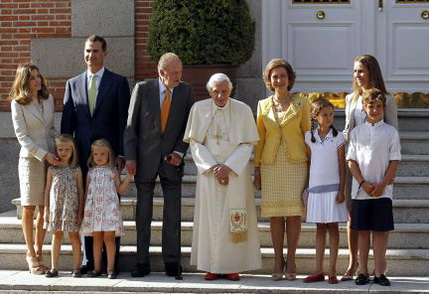 Sus Majestades los Reyes de España han recibido poco después de las 10.00 horas en el Palacio de La Zarzuela al Papa Benedicto XVI, en calidad de jefe de Estado. El Santo Padre ha sido recibido por sus Majestados en las escalinatas del palacio, donde también estaban   presentes en la escalinata la Infanta Elena, sus hijos, Froilán y Victoria Federica, y los Príncipes de Asturias con las Infantas Leonor y Sofía. Se trata de una visita de cortesia.