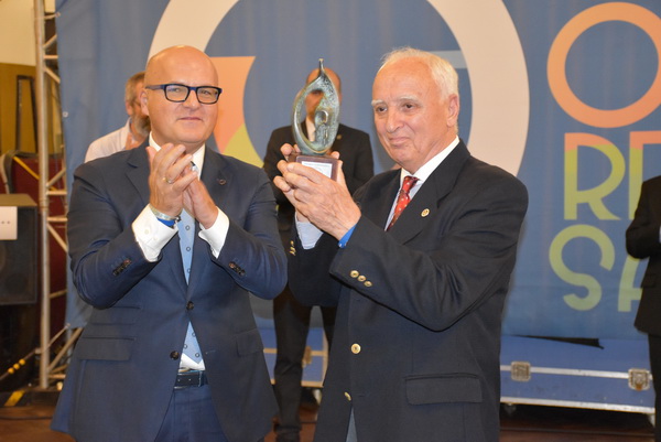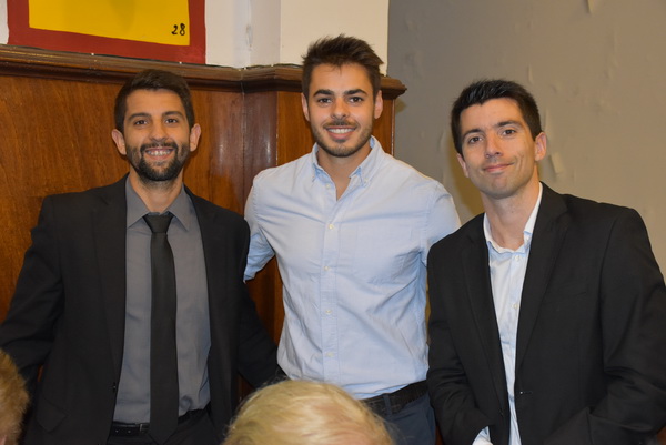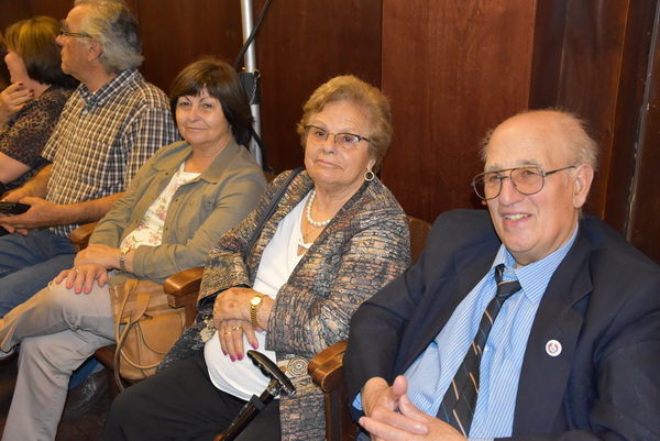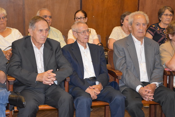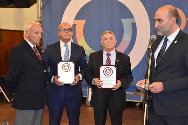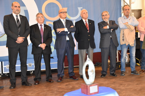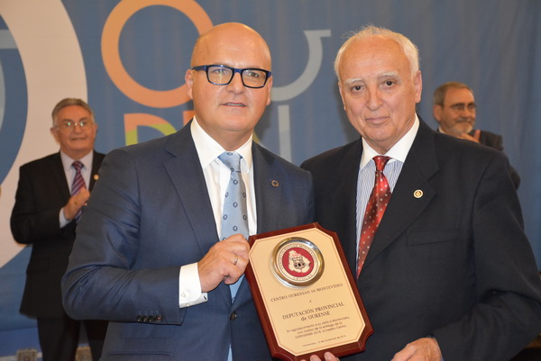 El presidente del Centro Orensano de Montevideo Jesús Vázquez acompañado por el presidente honorífico Eliseo Rivero, han recibido la premiación concedida en el salón de actos de Casa de Galicia de manos de José Manuel Baltar, de la diputación de Orense y Jose Luis Ferro, alcalde de Celanova.