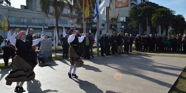La banda, bajo la dirección del director Cardozo, dio marco solemne al acto con sus interpretaciones de los himnos patrios de Uruguay y España para luego continuar los gaiteros con el himno de Galicia.