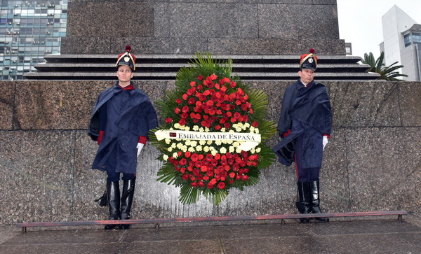 Solo se ha dejado de lado la caminata acostumbrada desde Plaza Independencia a Plaza España, pero allí, frente al mar, ha habido un alto en la persistente lluvia para permitir colocar la corona al pie de Isabel la Católica.