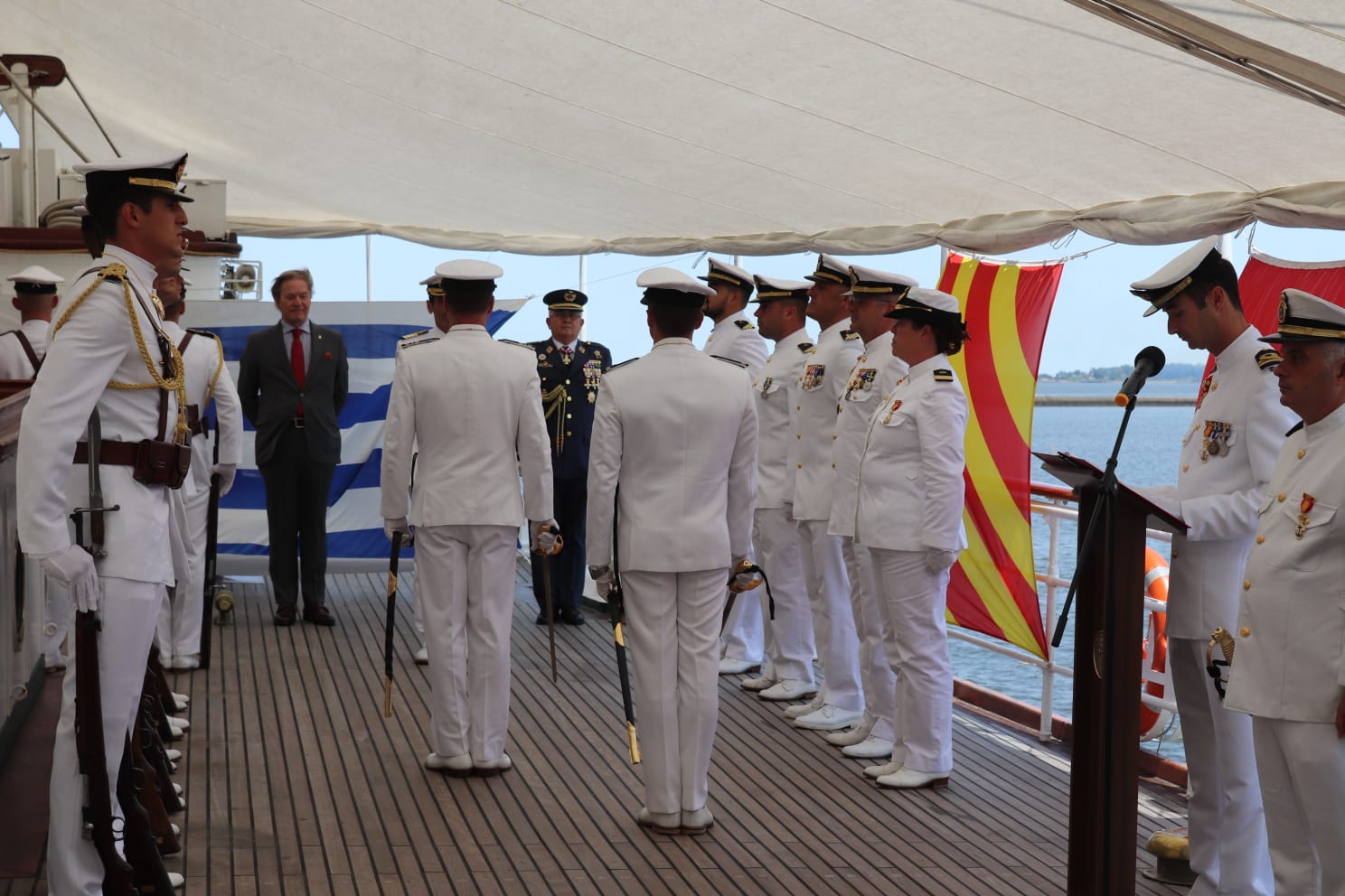 El buque, al mando del capitán de navío Santiago de Colsa Trueba, cuenta con una dotación formada por 174 hombres y mujeres. Asimismo, llevará a bordo a 55 guardiamarinas pertenecientes a la 422º promoción del Cuerpo General y 152º de Infantería de Marina. Además, este crucero contará con la presencia de guardiamarinas procedentes de las Armadas de Brasil, Chile, Perú y Uruguay.