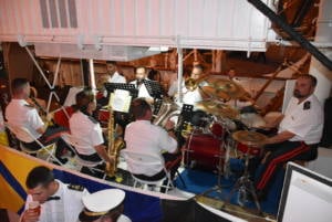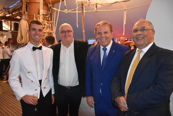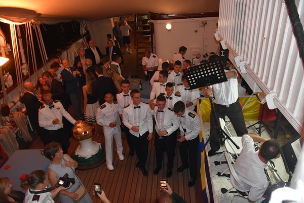 Los guardia marines con sus trajes de gala y con mucha amabilidad se han integrado a los invitados para compartir sus experiencias de viaje. La banda del buque amenizó la noche con un repertorio variado mientras fuimos agazajados con delicias gastronómicas elaboradas por los mismos cocineros del buque.