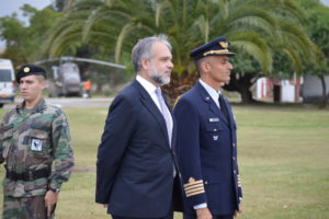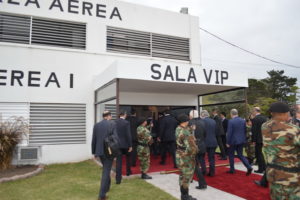Del avión a la sala vip para el recibimiento protocolar, escuchar  las estrofas de los himnos patrios de Uruguay y España interpretados por la banda de la armada nacional.