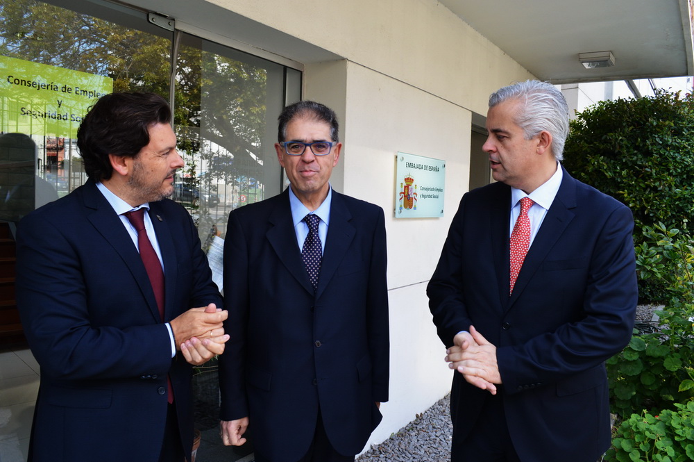 Miranda comenzó la jornada visitando la consejería de empleo de la embajada de España en Uruguay acompañado del delegado de la Xunta Alejandro López Dobarro quienes han sido recibidos por el consejero de empleo Benito Díez Arce y juntos planificaron las entrevistas que tendrían y documentos para firmar.