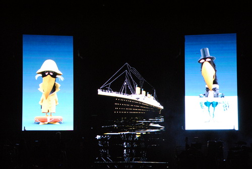 La voz en off muy conocida del presentador integrante de Les Luthier, dio paso a «La Orquesta del Titanic». Una animación del «paquebote Titanic» comenzó a navegar en el escenario hacia nosotros mientras el locutor indicaba que el problema había sido en la nominación del buque en vez de «paquebote» debería haber sido llamado «Paqueflote». El cuento dice que entre los que navegaban en el Titanic, además del actor Leonardo Di Caprio … y la orquesta , estaban éstos pájaros, refiriéndose a Serrat y Sabina..