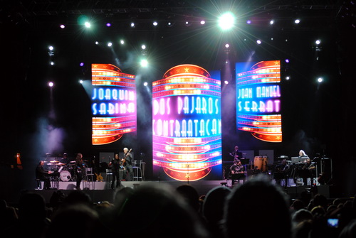 Un estadio charrúa hasta la bandera, y muy mojado, arropó a estos dos ilustres artístas de la madre patria. Una hora antes de comenzar el espectáculo de Joaquín Sabina Y Joan Manuel Serrat un persistente y torrencial chaparrón amenazó con volver a hundir el Titanic.
